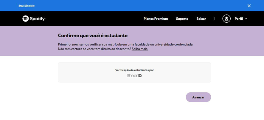 Clique no botão Avançar para iniciar o processo de verificação estudantil.