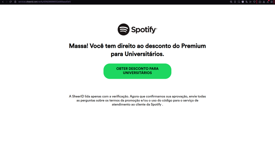 A verificação do vínculo acadêmico é feita por meio do e-mail institucional da MUST University, utilizando o sistema de validação estudantil do Spotify.