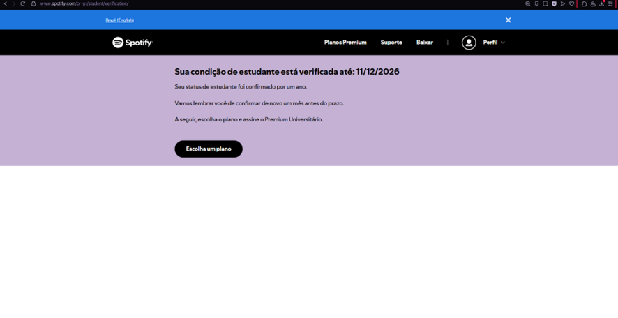 Após a confirmação do status estudantil, clique em Escolha um plano para finalizar a assinatura.