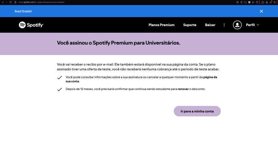 Clique em Ir para minha conta para retornar à sua página principal no Spotify.